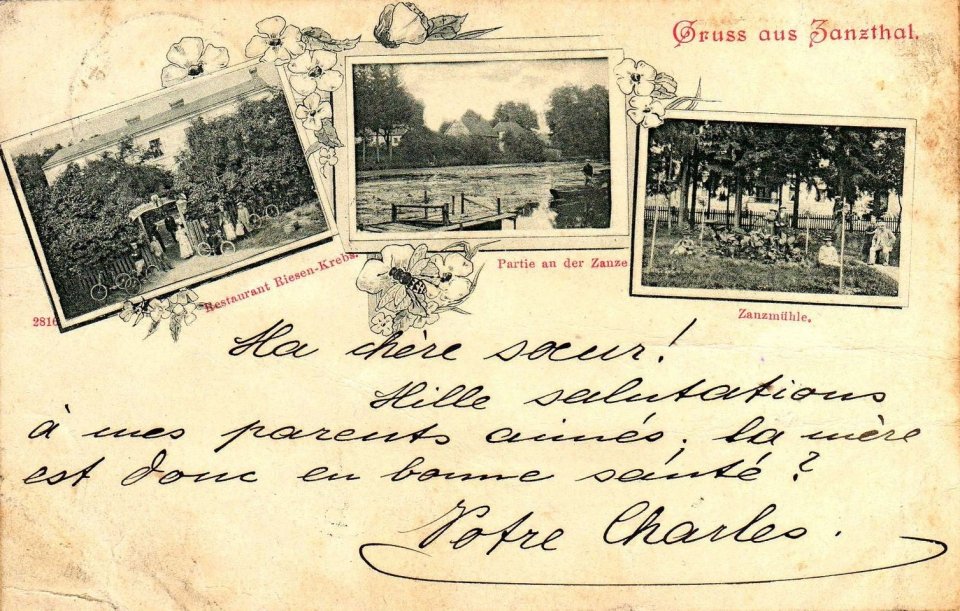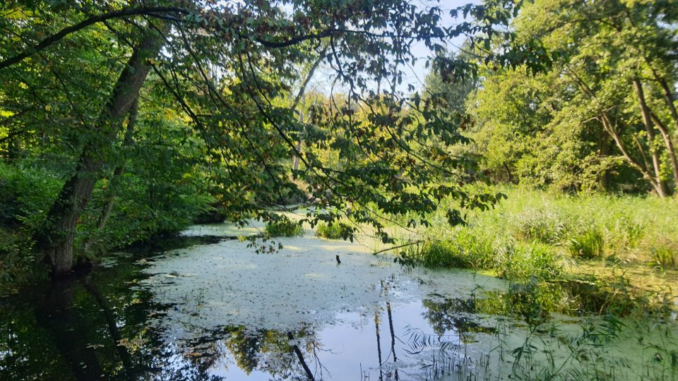 Stoisz przy dawnym stawie młyńskim Zanzmühlen Teich. W 1765 r. król Fryderyk II za 3000 talarów kupił od Chrystiana Wendlandta młyn wodny, zwany Zanzmühle, stojący przy wypływie Santocznej z jeziora Mrowino.