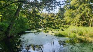 Po dotarciu do mostku na Santocznej, możesz dokładnie zobaczyć właśnie to miejsce. Trudno teraz w tej panującej tu leśnej ciszy wyobrazić sobie jak pracowita niegdyś była Santoczna, która jest główną osią naszej ścieżki edukacyjnej.